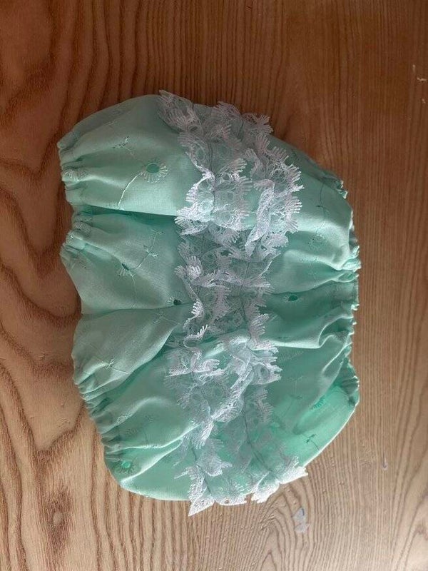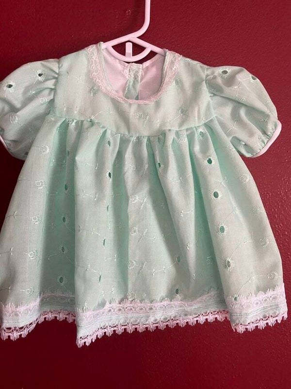 Beautiful Infant Girl Sets. Includes ruffled diaper cover. Back button closure on dress; soft elastic waist on panties. Deligate soft lace trim on the green eyelet selection. Beautiful ribbon trim on the blue selection. Both dresses have a lined bodice for a quality finished touch. Made in America. Machine wash/dry.