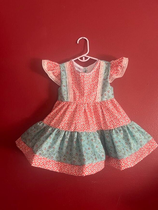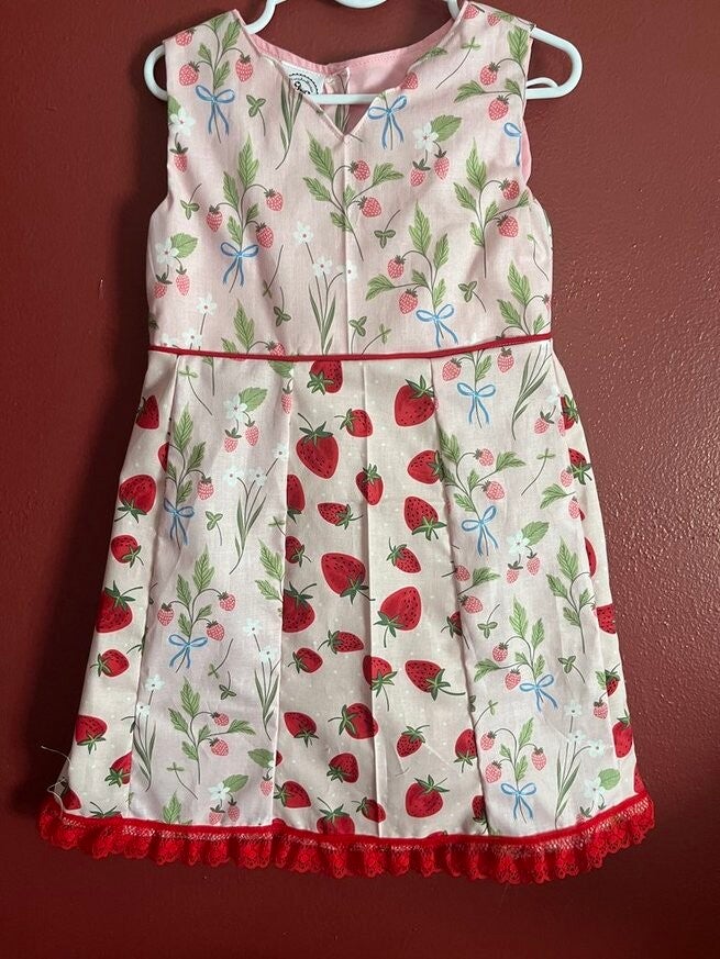 These are One-Of-A-Kind summer dresses. Coral flowers with bright coral calico ruffles and capped sleeves; teal and coral ruffled calico print; bees and daisies A-line style; Strawberries A-line