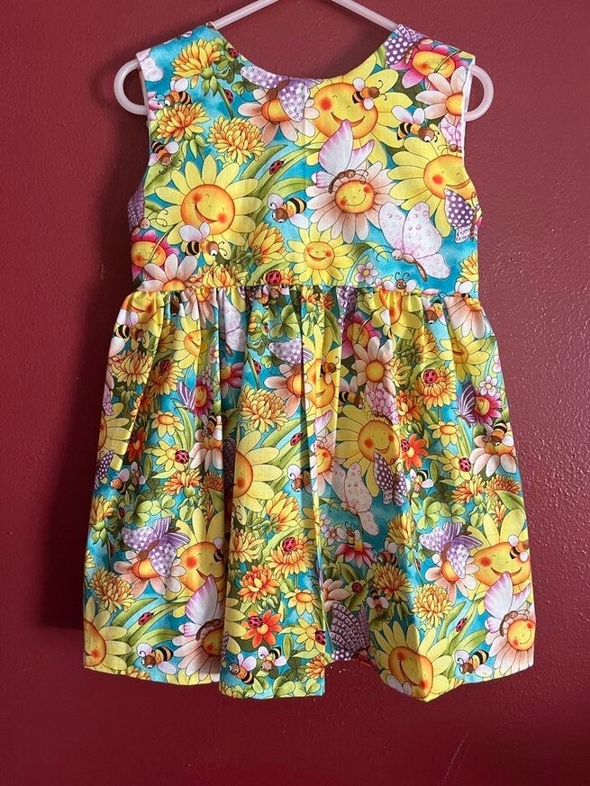 Sunny and cool summer dresses. Only one is available in each design/size. Calico Garden has ruffled straps and a button closure, with a very full skirt for ultimate twirling. Smling Daisies has a cute back tie closure and lined bodice. White eyelet has a back tie and a scalloped embroidered eyelet hem. Cream colored eyelet can be worn as a pinafore, as a cool summer dress or as a beach cover up. All are made from quality cotton fabrics. Made in USA. Sizes are listed with variations below.